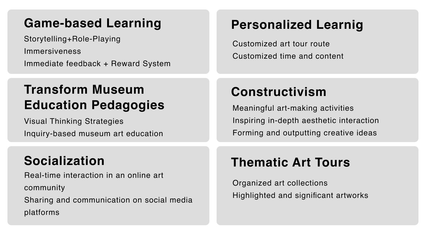 Based on the design thinking strategy, in the Ideate phase, we generate design solutions after a series of user research, pain points exploration, and literature review. They are categorized into 6 design directions: game-based learning, personalized learning, transform museum education pedagogies, constructivism, socialization, and thematic art tours.