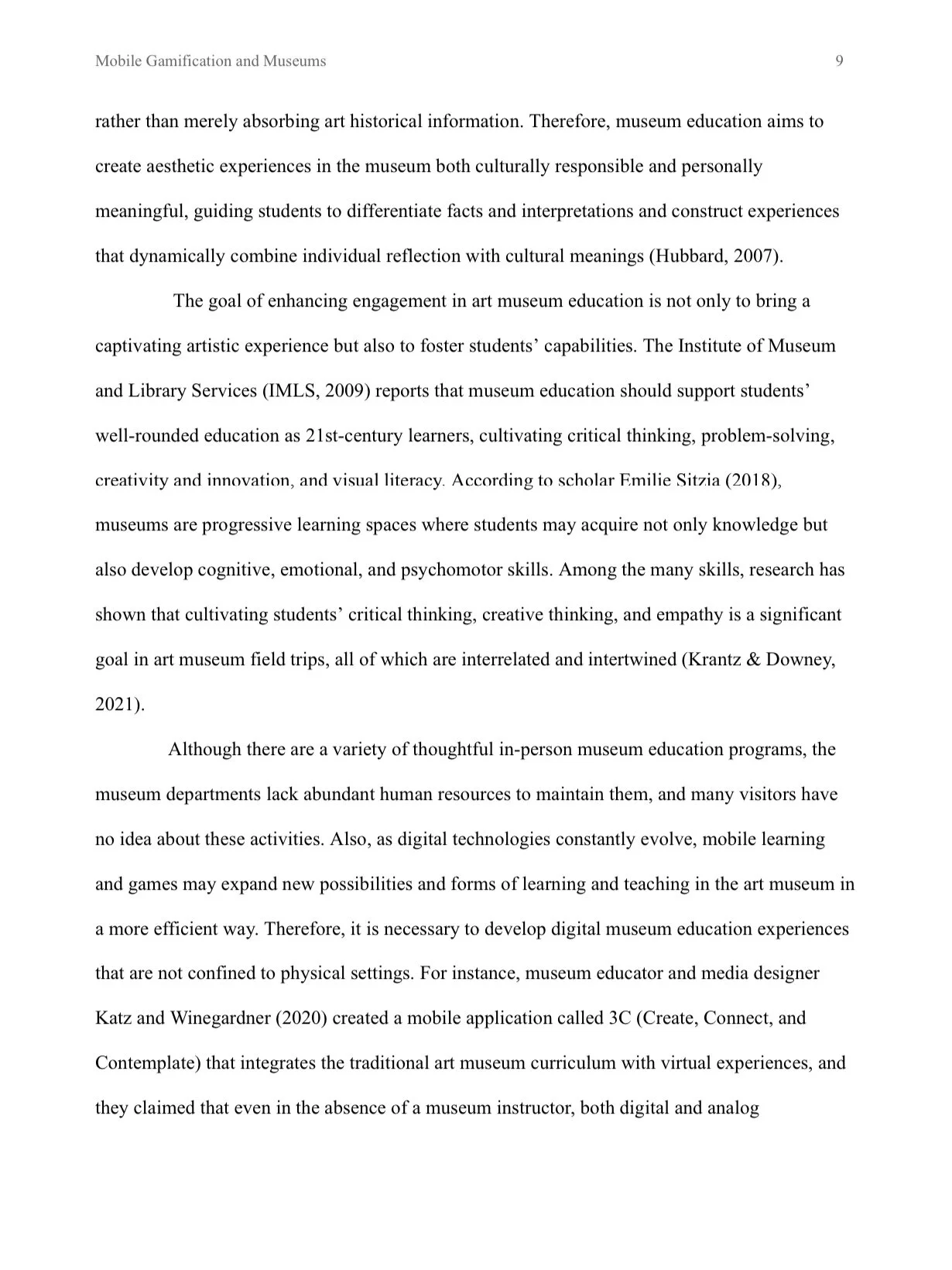 In order to understand the current development and application of mobile learning experiences in art museums, we conducted in-depth research and wrote a literature review, investigating scholars' views and published examples on gamification and digital transformation of museum education.