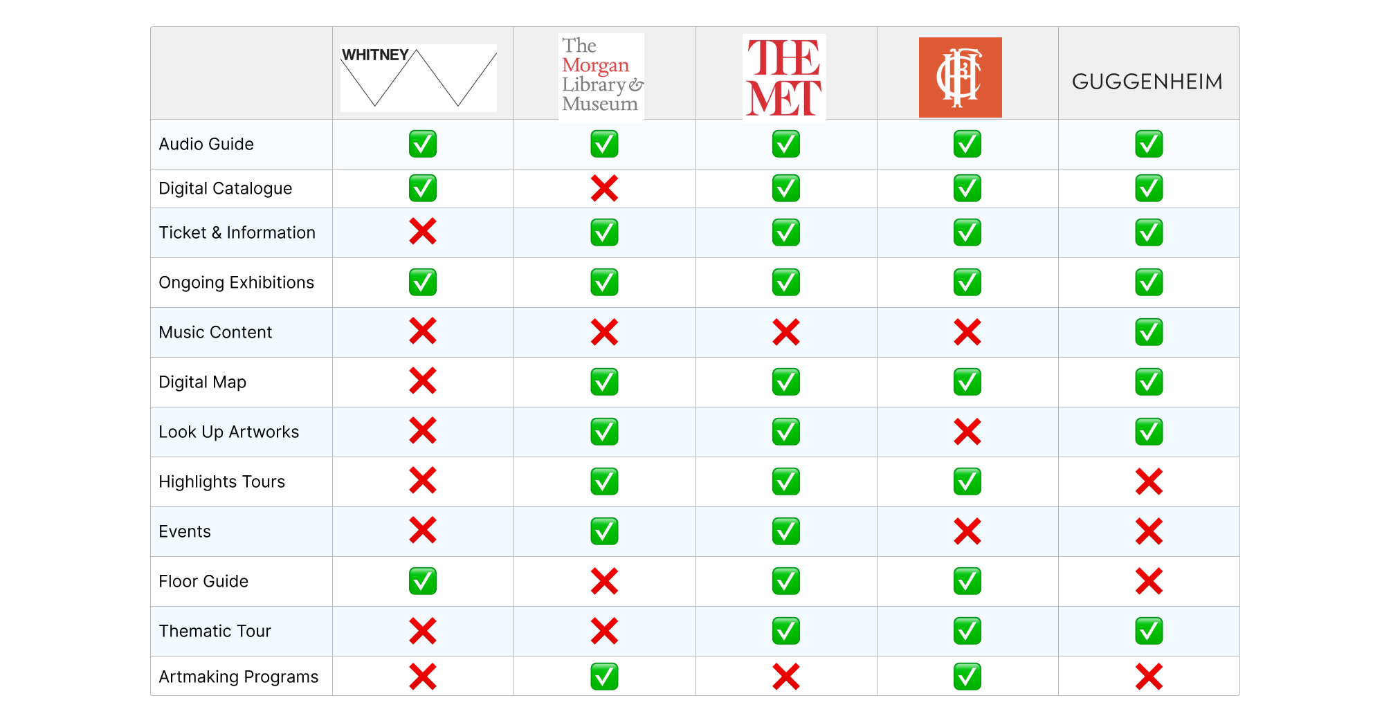 The Competitive Analysis evaluates the existing functions of other NYC museum digital guides. Based on the analysis, it is potential for us to incorporate new features of the thematic tour, artmaking, significant art route, online comments, and artwork up.