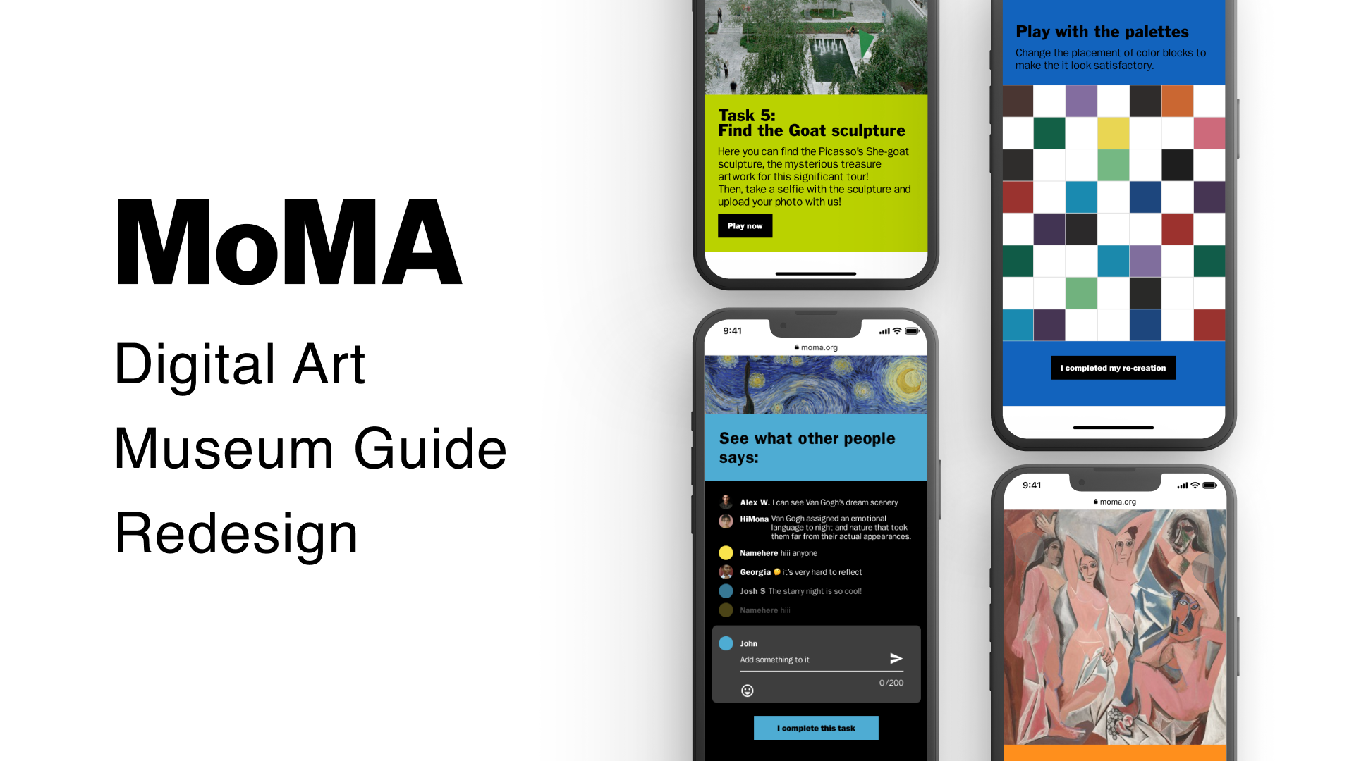 The possible solution is to use treasure hunting game and thematic art tours to guide visitors to have more engaging artistic experiences at MoMA. Our new design will transform in-person museum education curriculum to digital forms and build up an online art community for socialization. The creative artmaking feature will encourage audiences to interact more profoundly with artworks at MoMA.