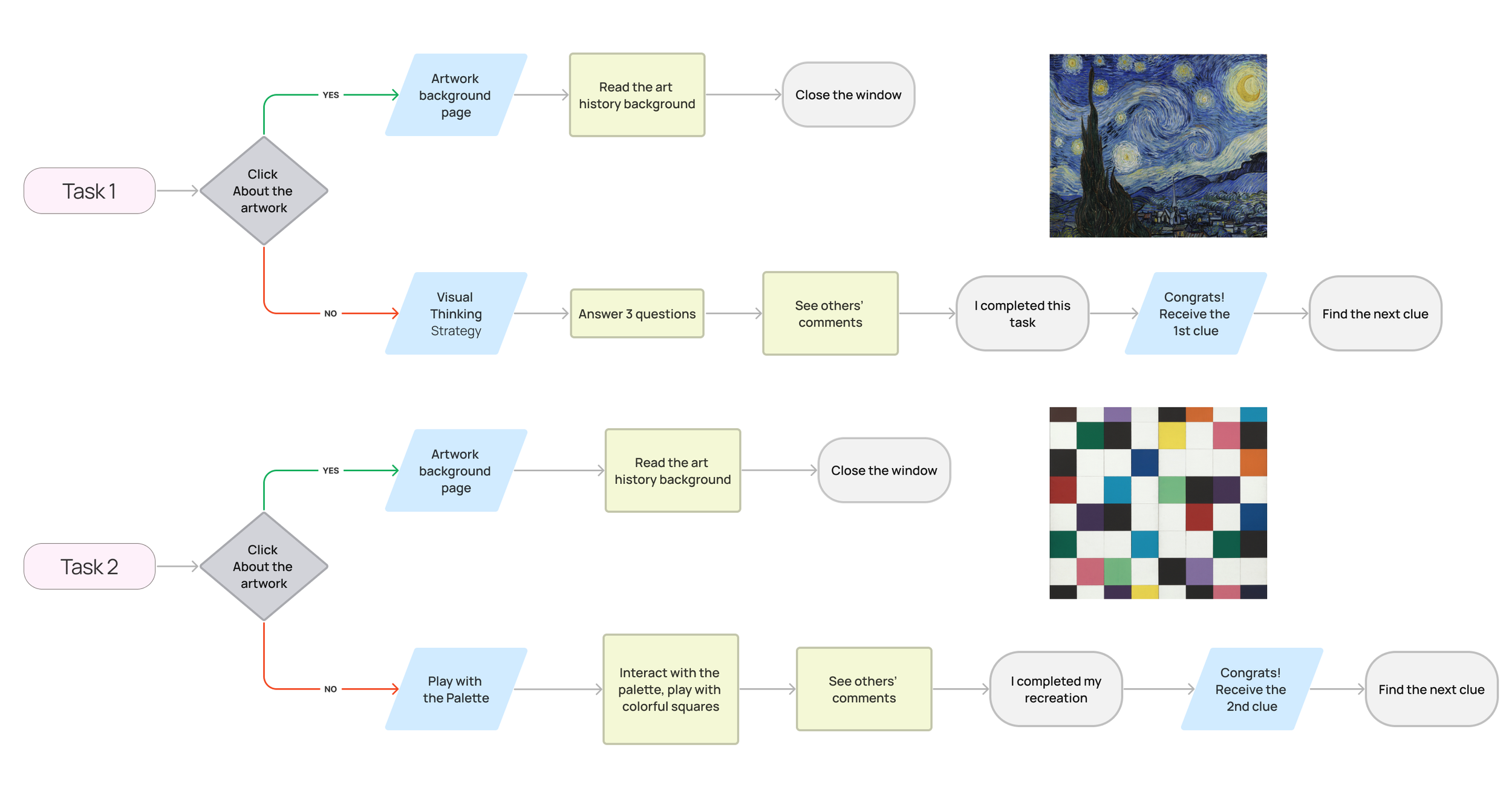 Before designing the high-fidelity prototype, we first listed the complete user flow so that we could more clearly design each interactive experience process, including buttons, selections, user actions, and art learning activities that will be included.